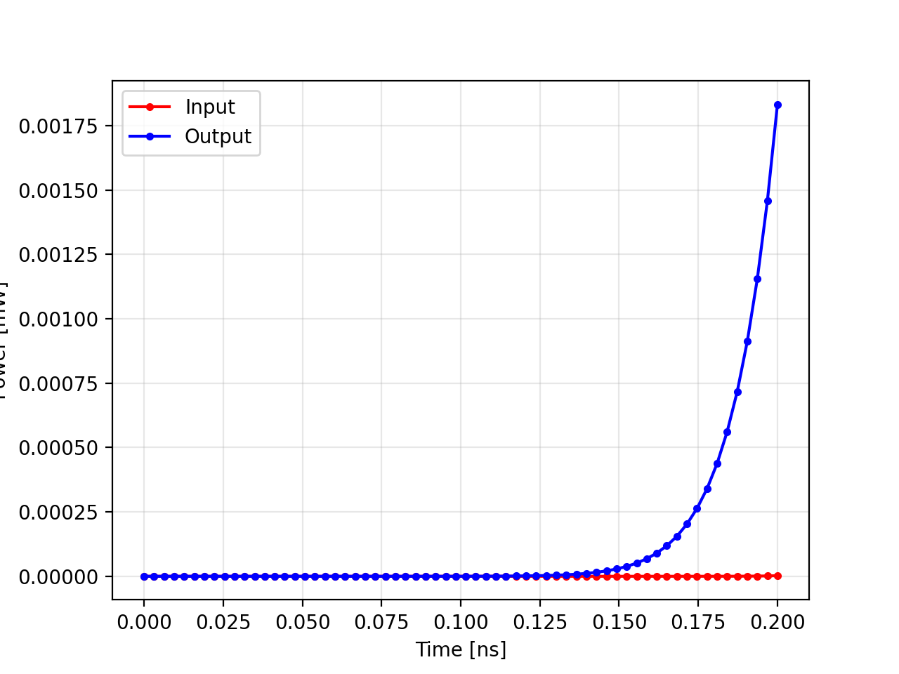 pulse_o.plot('b.-', label='Output').grid().legend().show() # plot, grid, legend and show the input and output pulses